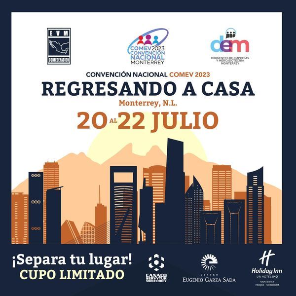 Nuestra magna reunión anual de la Confederación Mexicana de Ejecutivos de Ventas y Mercadotecnia AC se llevará a cabo en 2023 en la ciudad de Monterrey, reuniendo a grandes tomadores de decisiones de todo el país, quienes intercambiarán sus experiencias para mejorar las condiciones del sector mediante su participación en conferencias y talleres, además de la convivencias durante 3 días de actividades.