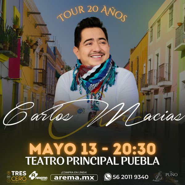 El compositor más exquisito de la última generación de compositores Carlos Macias, llega este viernes 13 de mayo al Teatro Principal de Puebla presentando su Tour 20 Años.