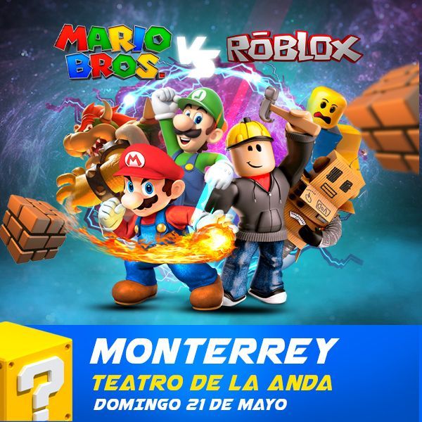 MARIO BROS VS ROBLOX. Un espectáculo para toda la familia donde podrás acompañar a Mario, Luigui, La Princesa Peach, Toad en esta increíble batalla contra los roblox donde Bowser se hace pasar por un villano de roblox para poder robar el cubo de poder, en su viaje al Mundo de Roblox alteró todo el sistema de multiverso de los videojuegos, Es por ello que Los Roblox desbloquean un nuevo nivel en su mundo pero los mando directo al mundo de Mario Bros,ya que ahí es donde se encuentra su cubo de poder, Para recuperarlo planean llevarse a la Princesa Peach, hasta que Bowser entregue el cubo les regresaran a la princesa.