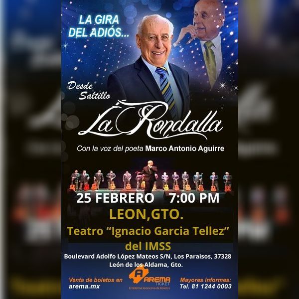Lo pediste y regresa! Desde Saltillo La Rondalla con la voz del poeta Marco Antonio Aguirre, en la gira del adiós..55 años de poesía y amor reviviendo los grandes éxitos! ÚNCIA FUNCIÓN!