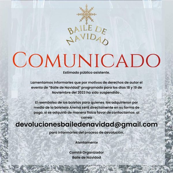 **Este evento fue cancelado por la empresa promotora del evento. El reembolso por el valor total de los boletos adquiridos puede ser solicitado en la plataforma arema.mx/reembolsos. Les recordamos que AREMA Ticket no realiza actividades de programación, promoción o cancelación de eventos, pero nuestros clientes pueden estar seguros que recuperarán su dinero, es parte del servicio que pagaron al comprar en nuestra plataforma. **