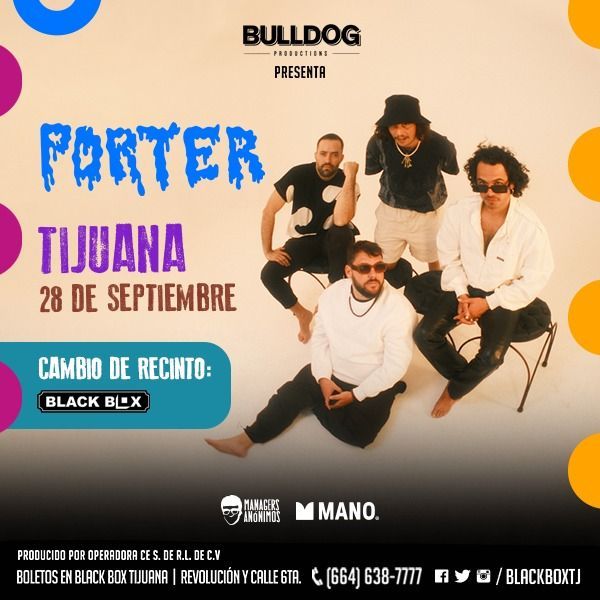 BULLDOG Productions PRESENTA PORTERSábado, 28 septiembre 2024BLACK BOXPrecios (Más cargo por servicio):$500 Preventa General$600 General$800 Preferente $1,200 VIP