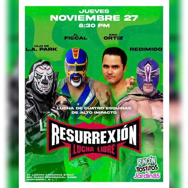 Sinopsis o información del evento: Lucha estelar de cuatro esquinas de alto impacto entre HIJO DE LA. PARK, EL FISCAL, ERIK ORTIZ Y REDIMIDO y 4 luchas más.