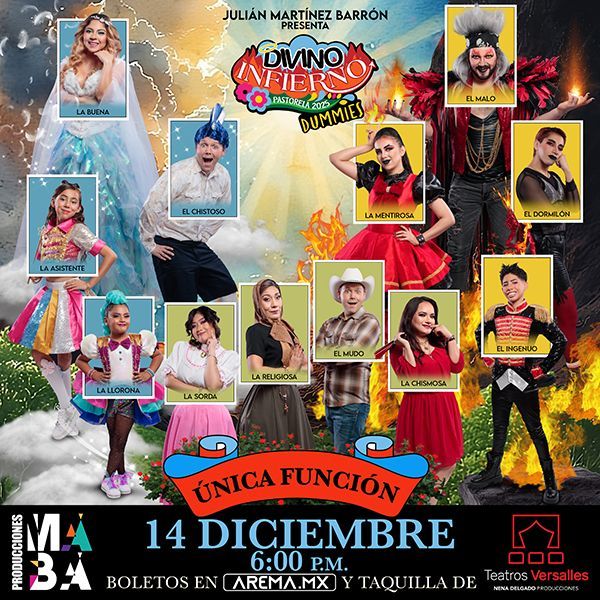 Sinopsis o información del evento: Primera Generación de Dummies en Producciones MABA, presenta, Divino Infierno es una pastorela cómica. Lucifer reúne un nuevo equipo de diablos para tentar a los pastores y no lleguen a Belén ¿Será que logre su objetivo? Ven y descubre las estrategias que tendrán los ángeles en este nuevo combate.