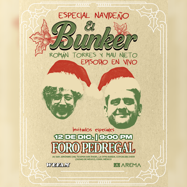 Sinopsis o información del evento: El podcast El Búnker llega al Foro Pedregal con un episodio en vivo para cerrar el año como se debe: entre risas, confesiones y un toque de caos navideño.