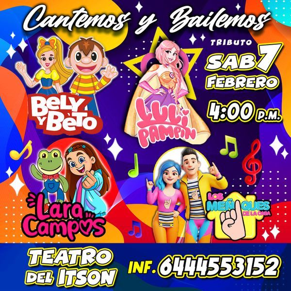 Acompaña a 'Lara Campos', 'Los Meñiques de la Casa', 'Luli Pamplin' y a 'Bely y Beto' - Tributo, - a la gran fiesta que ofrecerán en el Teatro del ITSON el sábado 7 de febrero en punto de las 4 de la tarde, ¡disfruta de una alegre y divertida aventura musical!
