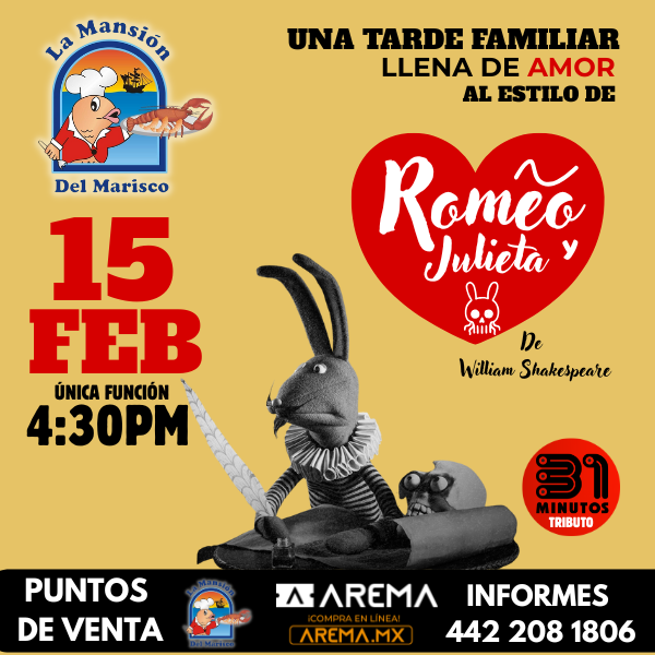 Este 15 de febrero, no te pierdas la única función de esta obra clásica de William Shakespeare, presentada con el mejor tributo de 31 minutos en La Mansión Del Marisco.