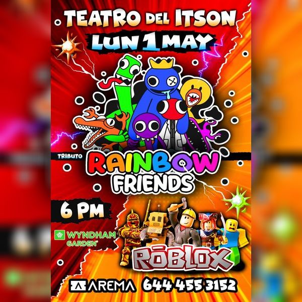 El primero de mayo llegará a ciudad Obregón ‘RAINBOW FRIENDS & ROBLOX’ para presentar una sola función en punto de las 6 de la tarde en el Teatro del ITSON, diviértete en grande con todos los personajes del video juego más aterrador y adictivo de los últimos tiempos.