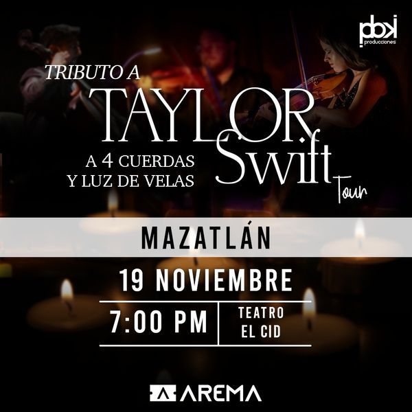 Evento único, en el cuál por medio de la luz de las velas y el sonido vibrante de 4 cuerdas, Te llevarán a un viaje relajante, emocionante y fascinante por los mejores éxitos de la cantante Taylor Swift.