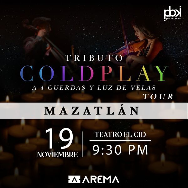 Evento único, en el cuál por medio de la luz de las velas y el sonido vibrante de 4 cuerdas, Te llevarán a un viaje relajante, emocionante y fascinante por los mejores éxitos de la banda Coldplay.