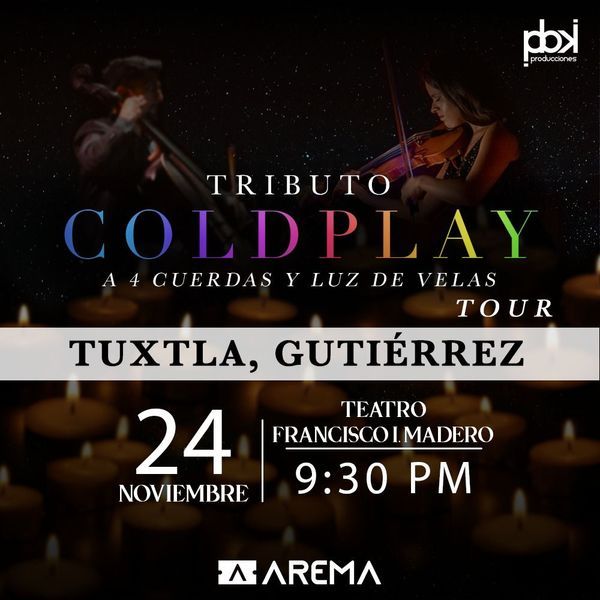 Evento único, en el cuál por medio de la luz de las velas y el sonido vibrante de 4 cuerdas, Te llevarán a un viaje relajante, emocionante y fascinante por los mejores éxitos de la banda Coldplay.