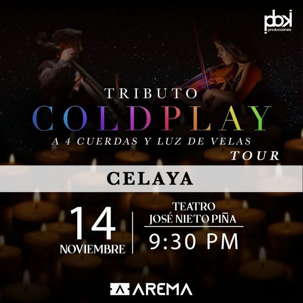 Evento único, en el cuál por medio de la luz de las velas y el sonido vibrante de 4 cuerdas, Te llevarán a un viaje relajante, emocionante y fascinante por los mejores éxitos de la banda Coldplay.