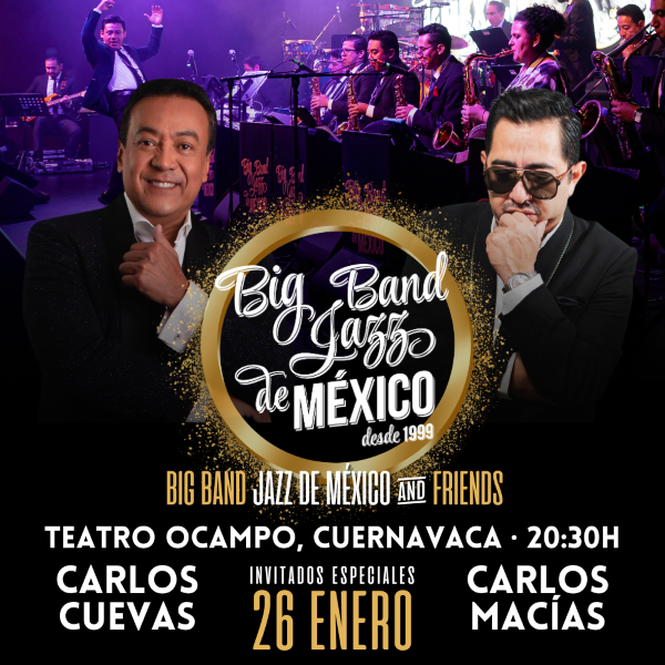 La Big Band más importante de América Latina llega al Teatro Ocampo en Cuernavaca, Morelos, acompañados de Carlos Cuevas y Carlos Macías, para regalar una velada llena de música y romanticismo.