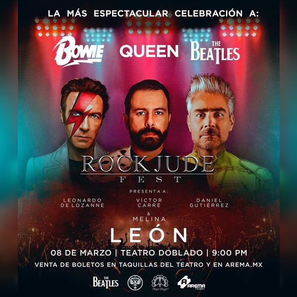 “Llega la gira Rock Jude Fest 2024 al Teatro Manuel Doblado, con la más grande celebración a David Bowie, Queen y The Beatles con Leonardo de Lozanne, Daniel Gutiérrez, Víctor Carré y la Banda Melina en un concierto donde cada figura de nuestro Rock nacional rinde homenaje a la banda que los influenció en sus carreras musicales en un espectáculo que todo amante del Rock debe vivir.”