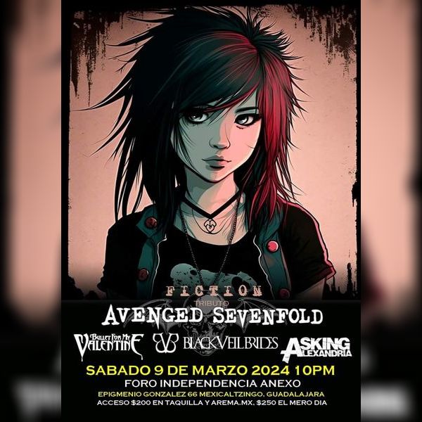 Fiction presenta su excelente tributo en vivo a Avenged Sevenfold y ademas tus rolas favoritas de Bullet for My Valentine, Black Veil Brides, Asking Alexandria. De las mejores bandas actuales de Heavy Metal, Metalcore. No te pierdas esta noche llena de energia.