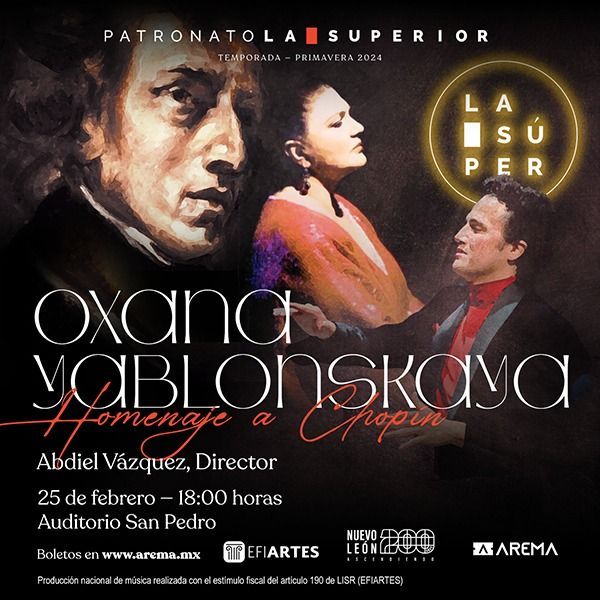 El Patronato de la ESMDM se complace en presentar a la virtuosa pianista Oxana Yablonskaya acompañada por primera vez en Monterrey por una orquesta, “La Súper”, dirigida por Abdiel Vázquez, para rendir un homenaje al gran compositor polaco Frédéric Chopin en su 125º aniversario luctuoso.