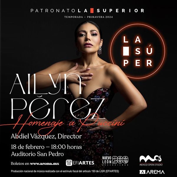 El Patronato de la ESMDM se complace en anunciar un evento histórico en Monterrey. El debut en tierras mexicanas de la destacada soprano Ailyn Pérez que se unirá a “La Súper”, dirigida por Abdiel Vázquez, para rendir un emotivo homenaje en su 100º aniversario luctuoso, al incomparable Giacomo Puccini, uno de los grandes maestros de la ópera en una noche única.