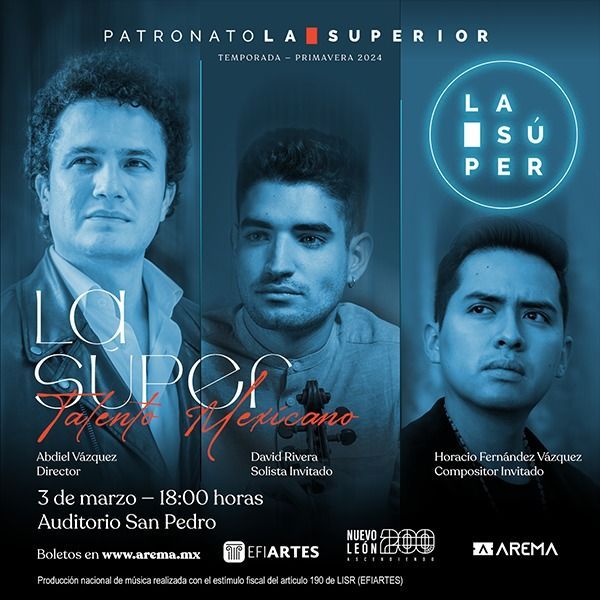 El Patronato de la ESMDM tiene el honor de invitarlos a esta gala de grandes talentos de México para el mundo. Iniciando con el estreno mundial de “Rebajado” de Horacio Fernández Vázquez, seguido por la interpretación de un concierto para solista y orquesta del ganador del concurso de Solistas de “La Súper”, para cerrar el programa con la espectacular Sinfonía No. 5 de Tchaikovsky, una de las obras más populares y emblemáticas del gran compositor ruso. La orquesta será dirigida por Abdiel Vázquez.