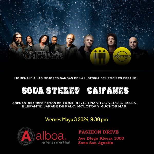 Revive grandes exitos del rock en espeñol en vivo con los top hits de Caifanes y Soda Stereo y algo mas este viernes 3 de mayo en Alboa Fashion Drive, uno de los lugares mas exclusivos de la ciudad donde disfrutaras de un completisimo menu para todos los gustos.