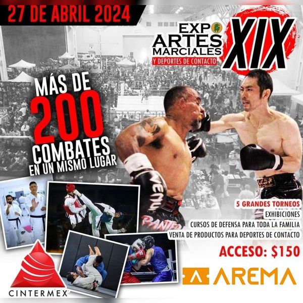 5 Grandes Torneos reunidos en CINTERMEX MAS DE 200 COMBATES! JIU JITSU, BOX, TAE KWON DO, KARATE, MUAY THAI. EXPO ARTES MARCIALES 19 EDICION SABADO 27 DE ABRIL SALA H Seminarios y Talleres; vente listo para entrenar!!! AMBIENTE 100% FAMILIAR,PUEDES ESTAR TODO EL DIA EN ACCION MARCIAL. Venta de equipo y productos para deportes de contacto. info:8112440003