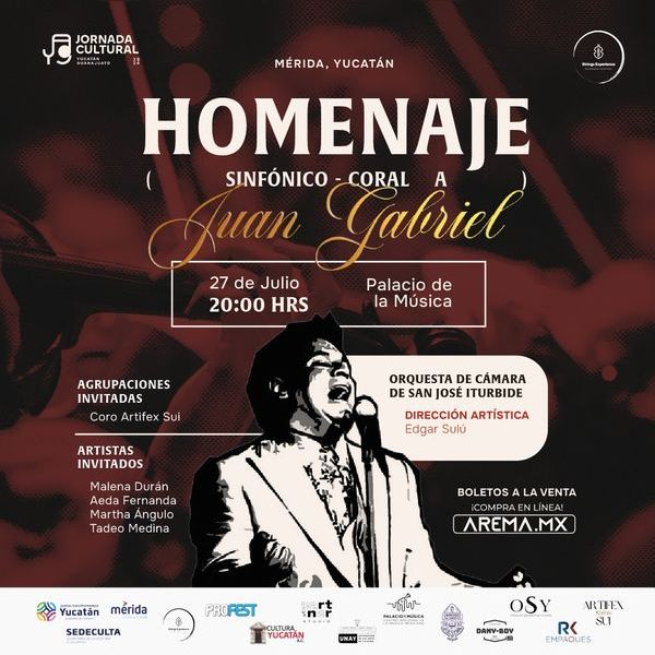 Este próximo sábado 27 de julio a las 08:00 de la noche, nos encontraremos en el palacio de la música para hacer un homenaje tributo a Juan Gabriel acompañado de la orquesta de Cámara de San José Iturbide provinientes del estado de Guanajuato como parte de la Jornada Cultural Yucatán-Guanajuato 2024.