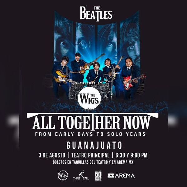 La fiesta más grande a la Beatlemanía de todo México llega por primer vez a Guanajuato Capital con All Together Now, el primer espectáculo en vivo en el que por primera vez y en una sola noche revivirás los éxitos más grandes de la legendaria banda The Beatles desde sus primeros años hasta las canciones que consagraron las carreras como solistas de John, Paul, George y Ringo, interpretados magistralmente por el mejor Tributo a The Beatles en México: The Wigs! Celebrando 20 años de carrera internacional, representantes de nuestro país en Liverpool, Inglaterra en 2014 y 2020. Ven a Cantar y bailar al ritmo de estas melodías atemporales y experimenta la emoción de la música en vivo mientras celebramos el legado musical de The Beatles. ¡Compra tus entradas hoy y únete a nosotros para una noche inolvidable de música!