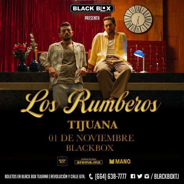 BLACK BOX PRESENTALos Rumberos1ro noviembre 2024Solo mayores 18+IDPrecios (Más cargo por servicio):$350 pesos General$500 pesos VIP