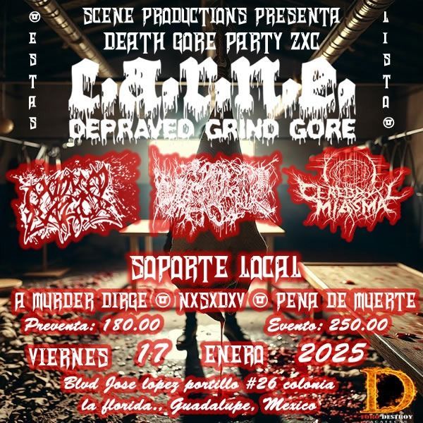 Después de 15 años regresa a Zacatecas,—C.A.R.N.E.—Una de las mejores bandas de Gore de México. Death Gore Party Zac estará acopado de poderosas bandas del Ruido Nacional les como Oxidised Razor con una trayectoria de más de 20 años.
