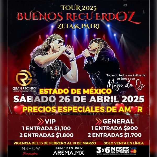 Zeta& Patricia Tapia llegan con su nueva gira: BUENOS RECUERDOZ TOUR 2025 " donde nos harán un recorrido musical de su época con su antigua banda \"MAGO DE OZ. Con un set list totalmente nuevo, en donde los recuerdOZ llegarán desde el disco de hechizo, hasta bandera negra.
