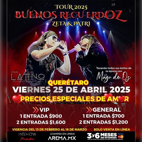 Zeta& Patricia Tapia llegan con su nueva gira: BUENOS RECUERDOZ TOUR 2025 \" donde nos harán un recorrido musical de su época con su antigua banda \"MAGO DE OZ. Con un set list totalmente nuevo, en donde los recuerdOZ llegarán desde el disco de hechizo, hasta bandera negra.