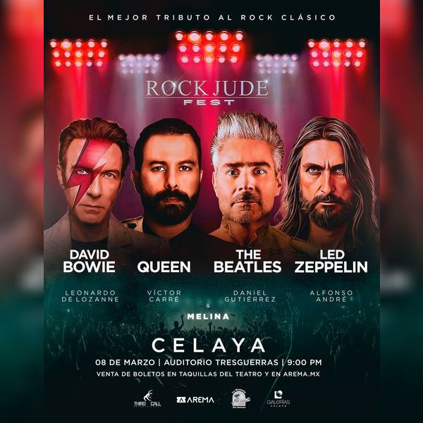 Daniel Gutiérrez (La Gusana Ciega) homenajeando a THE BEATLES, Leonardo de Lozanne (Fobia) homenajeando a DAVID BOWIE, Alfonso André (Caifanes) homenajeando a LED ZEPPELIN y Víctor Carré (Melina) homenajeando a QUEEN. Vive con nosotros este espectáculo que ha recorrido la República reuniendo a todos los amantes del Rock Clásico y Rock Mexicano en un mismo lugar.
