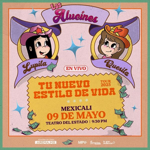 Llega por primera vez a Mexicali el show en vivo del podcast de comedia número 1 del momento: LAS ALUCINES, presentando -Tu nuevo estilo de vida Tour 2025. Acompaña a Lupita y a Quesito en un espectáculo lleno de risas, anécdotas y muchas sorpresas para las mejores fans de México. ¡No te lo puedes perder!