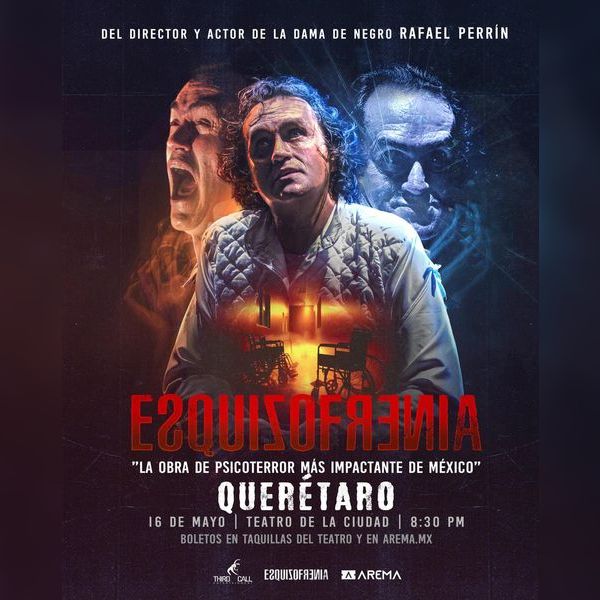 Regresa a Querétaro la experiencia de Psicoterror más impactante de México: ESQUIZOFRENIA! Ven a sentir el terror y suspenso completamente en vivo dentro de una sala de Teatro con la escalofriante historia que vivió el doctor Emile Tuck, quien en 1914 se internó por voluntad propia en un hospital psiquiátrico para estudiar de primera mano la enfermedad mental más aterradora que puede experimentar el ser humano. Con el director y Primer actor de La Dama de Negro, el maestro del terror Rafael Perrín quien te llevará de la mano a través de esta extraordinaria puesta en escena con más de 8 años ininterrumpidos en cartelera de la CDMX llena de suspenso que pondrá a prueba tu cordura y resistencia mental porque aquí no serás un espectador más, sino que todos los presentes formarán parte de esta experiencia que se quedará grabada en su mente para siempre.