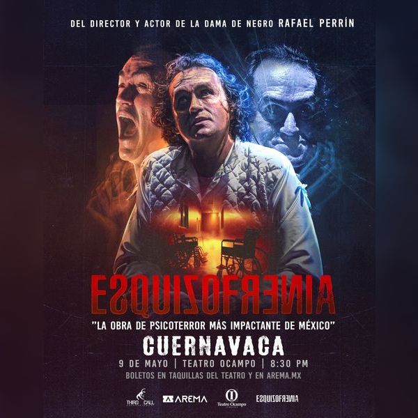 Por primera vez en Cuernavaca llega la experiencia de Psicoterror más impactante de México: ESQUIZOFRENIA! Ven a sentir el terror y suspenso completamente en vivo dentro de una sala de Teatro con la escalofriante historia que vivió el doctor Emile Tuck, quien en 1914 se internó por voluntad propia en un hospital psiquiátrico para estudiar de primera mano la enfermedad mental más aterradora que puede experimentar el ser humano. Con el director y Primer actor de La Dama de Negro, el maestro del terror Rafael Perrín quien te llevará de la mano a través de esta extraordinaria puesta en escena con más de 8 años ininterrumpidos en cartelera de la CDMX llena de suspenso que pondrá a prueba tu cordura y resistencia mental porque aquí no serás un espectador más, sino que todos los presentes formarán parte de esta experiencia que se quedará grabada en su mente para siempre