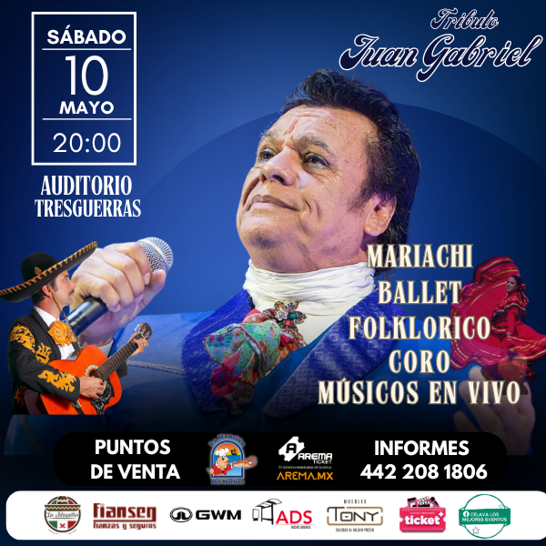 ¡El tributo más grande y emocionante del año llega a Celaya! Este 10 de mayo festejemos a mamá, en el Auditorio Tresguerras, rendimos homenaje a la leyenda Juan Gabriel con una noche llena de música, baile y emoción.