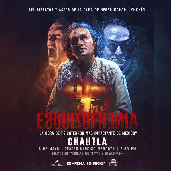 “Por primera vez en Cuautla Morelos, llega la experiencia de Psicoterror más impactante de México: ESQUIZOFRENIA! Ven a sentir el terror y suspenso completamente en vivo dentro de una sala de Teatro con la escalofriante historia que vivió el doctor Emile Tuck, quien en 1914 se internó por voluntad propia en un hospital psiquiátrico para estudiar de primera mano la enfermedad mental más aterradora que puede experimentar el ser humano. Con el director y Primer actor de La Dama de Negro, el maestro del terror Rafael Perrín quien te llevará de la mano a través de esta extraordinaria puesta en escena con más de 8 años ininterrumpidos en cartelera de la CDMX llena de suspenso que pondrá a prueba tu cordura y resistencia mental porque aquí no serás un espectador más, sino que todos los presentes formarán parte de esta experiencia que se quedará grabada en su mente para siempre.”