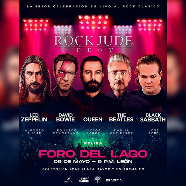 Regresa a León la mejor celebración al Rock Clásico con las grandes figuras de la escena del Rock Nacional: ROCK JUDE FEST. En esta edición con Leonardo de Lozanne (Fobia), Daniel Gutiérrez (La Gusana Ciega), Alfonso André (Caifanes), José Fors (La Cuca) y Víctor Carré (Melina), interpretando los grandes éxitos de David Bowie, The Beatles, Led Zeppelin, Blanck Sabath y Queen”