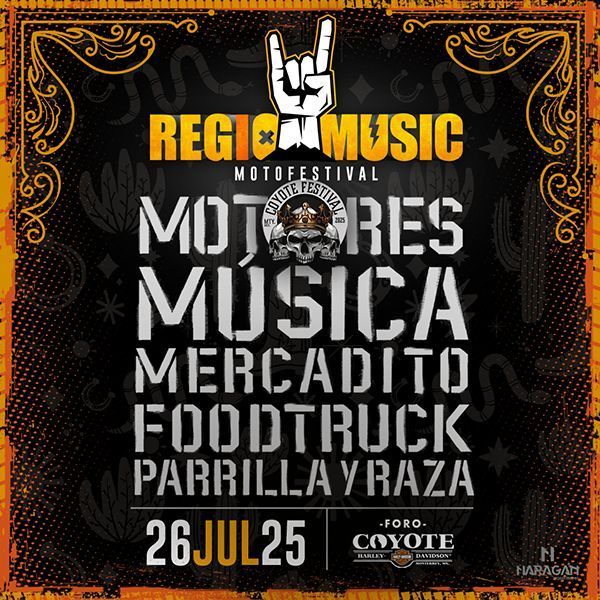 Bienvenido al festival motor más poderoso del norte del país, la cultura regia y el rugir de las motos se mezclan para pasar un día inolvidable con toda la familia, más música, más parrilla, más motos y más raza en la más grande de Latinoamérica Coyote Harley Davidson en Santiago Nuevo León México, vive la experiencia REGIOMUSIC Motofestival 2025.