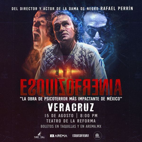 Llega a Veracruz la experiencia de Psicoterror más impactante de México: ESQUIZOFRENIA! Ven a sentir el suspenso completamente en vivo dentro de una sala de Teatro con la escalofriante historia que vivió el doctor Emile Tuck, quien en 1914 se internó por voluntad propia en un hospital psiquiátrico para estudiar de primera mano la enfermedad mental más aterradora que puede experimentar el ser humano. Con el director y Primer actor de La Dama de Negro, el maestro del terror Rafael Perrín quien te llevará de la mano a través de esta extraordinaria puesta en escena con más de 8 años ininterrumpidos en cartelera de la CDMX llena de suspenso que pondrá a prueba tu cordura y resistencia mental porque aquí no serás un espectador más, sino que todos los presentes formarán parte de esta experiencia que se quedará grabada en su mente para siempre.
