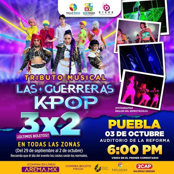 Sinopsis o información del evento: El mejor espectáculo tributo a Las Guerreras K-Pop llega a Puebla, Las Super Estrellas del K-Pop (Rumi, Mira y Zoey) ya están listas con todos sus superpoderes para un musical donde se encontrarán con su Banda rival (Los Saja Boys), y hacer de ésta experiencia musical algo inolvidable, recuerda que es un espectáculo para todas las edades y que se debe de disfrutar en familia.