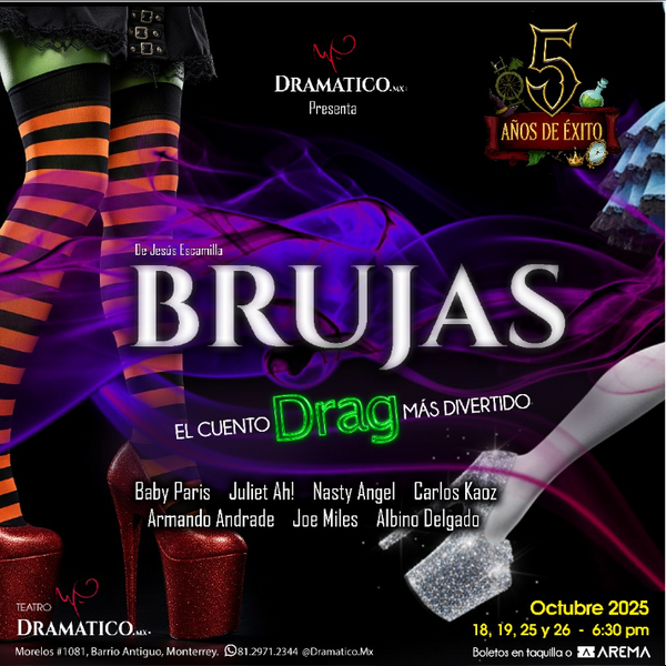 Celebrando su quinto año de éxito en Monterrey, regresa una de las puestas en escena más aclamadas y originales del teatro contemporáneo local: BRUJAS DRAG, un espectáculo lleno de humor, fantasía y talento Drag, con el sello inconfundible de calidad de DramáticoMx.