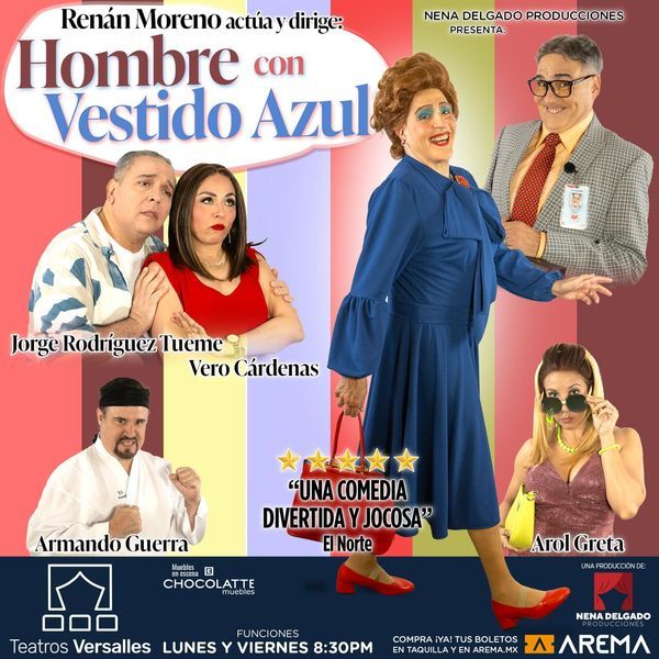 Hombre con vestido azul es una divertida comedia donde los enredos suceden una y otra vez. Omar y Miriam son un matrimonio de clase media acomodada que están en medio de una crisis, ya que Omar tiene una amante llamada Katy, quien también está casada con Pedro. Pero un día aparece Patricio, un peculiar personaje, quien intentará ayudar a Omar salir de sus problemas, pero en vez de solucionarlos, lo que logra es que se desaten muchas situaciones hilarantes y divertidas.