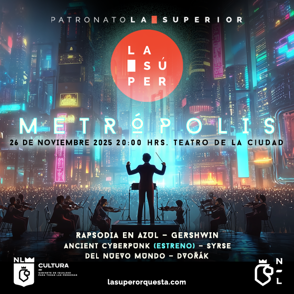 El Patronato de la ESMDM y La Súper Orquesta dirigida por Abdiel Vázquez presentan Metrópolis, un concierto que celebra la energía de las grandes ciudades y la fuerza creativa que impulsa al ser humano a imaginar, construir y trascender.