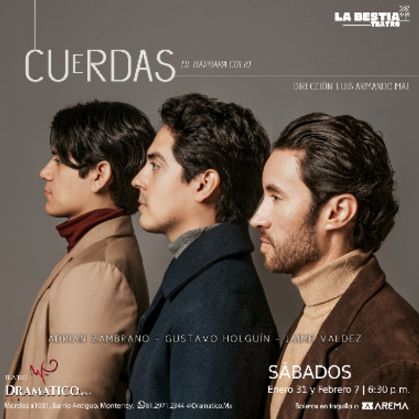 Sinopsis o información del evento: La Bestia Teatro presenta “Cuerdas” Peter, Paul y Prince son tres hermanos que se citan en el aeropuerto para emprender un viaje juntos para reencontrarse con su padre del que no saben nada desde hace 25 años. El padre pide reencontrarse con sus hijos en su último gran espectáculo que quiere compartir con ellos.