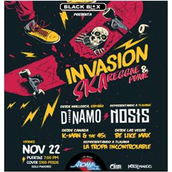 Desde Montreal, Las Vegas, Los Angeles, Tijuana y Mallorca llega el SKA PUNK NIGHT con los grupos Dinamo, Nosis, K-Man and the 45´s, UWC, Be Like Max y La Tropa Incontrolable, este 22 de Noviembre en el ercer Piso del Black Box de Tijuana.\nPREVENTA $100 pesos.