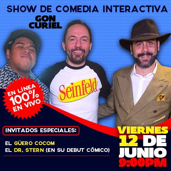 Show de comedia interactiva en línea 100% en vivo con Gon Curiel y sus invitados especiales: El Güero Cocom y El Dr. Stern en su debut cómico.