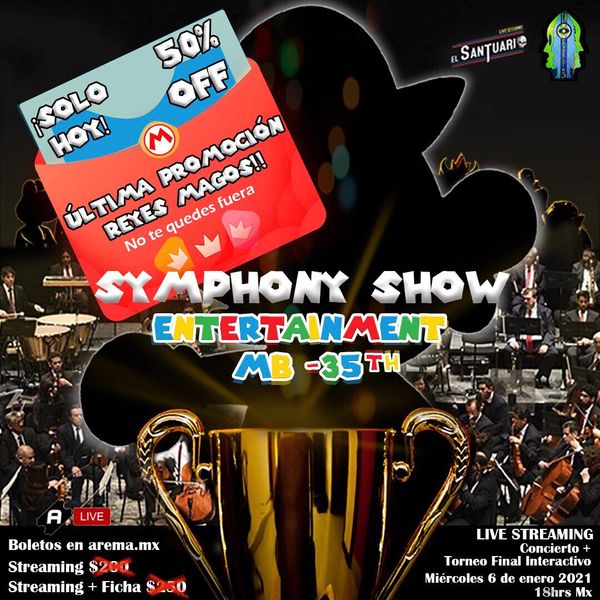 Evento de celebración 35 Aniversario Súper Mario Bros en formato concierto digital donde se ejecuta lo mejor de la música de Super Mario Bros 1, 2,3, World, 64, Sunshine, Odyssey para Ensamble Orquestal a través de la fantástica plataforma SANTUARIO LIVE en calidad insuperable FULL HD LIVE STREAMING audio y video 100 % EN VIVO mientras se proyectan imágenes de los pasajes más iconograficos o referentes de dichos títulos. En la parte intermedia del espectáculo se realiza una dinámica interactiva a manera de concurso con los 4 últimos finalistas que hayan logrado superar las pruebas y alcanzado el puntaje más alto en la contienda pública realizada durante la campaña publicitaria en la quincena previa del evento. Dichos concursantes se medirán a 2 Gamers-Influencers de talla internacional para la Gran Final que está dividida en dos etapas: