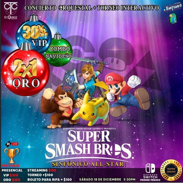 Celebra el 1er Aniversario Symphony Show Entertainment en el evento espectacular SÚPER SMASH BROS SINFÓNICO ALL STAR!! en formato PRESENCIAL y ONLINE FULL HD Live STREAMING Audio y Video 100% EN VIVO donde podrás disfrutar de lo mejor de la música de cada uno de los títulos estelares de NINTENDO: Súper Mario Bros, The Legend of Zelda, Donkey Kong y Pokémon mientras se transmiten imágenes de los pasajes clásicos y emblemáticos de los juegos.