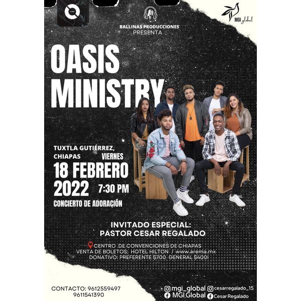 OASIS MINISTRY 18 DE FEBREROCENTRO DE CONVENCIONES CHIAPAS7:30 PMPREFERENTE: $700.00GENERAL: $400.00