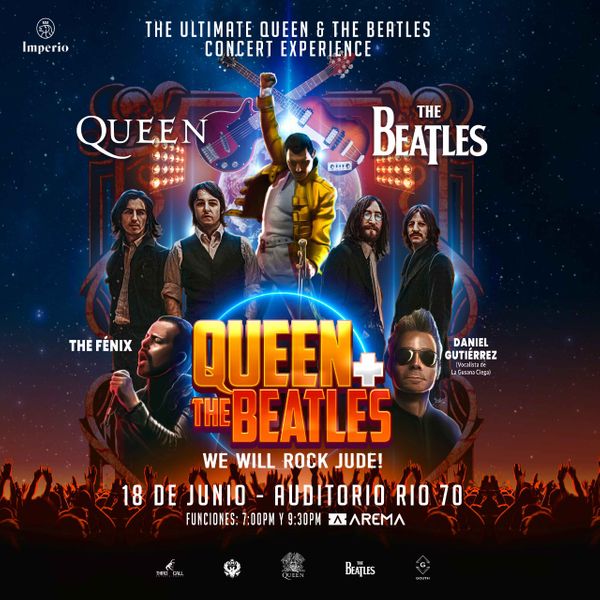 Un Espectáculo Único que conjunta un Concierto en Vivo con un Show Multimedia simultáneamente que te llevará en un Viaje Musical a través de los grandes Éxitos de dos de las más icónicas Bandas del Rock Mundial: Queen y The Beatles.